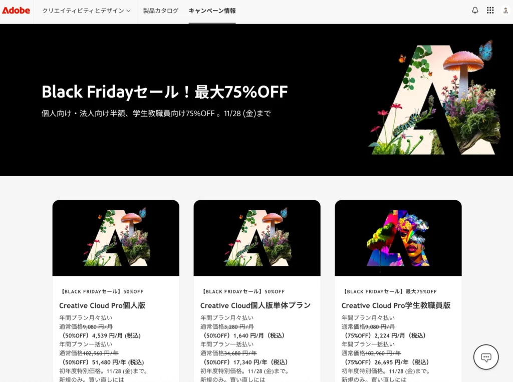 【セール】Adobe Creative Cloud Proの初回購入が50%OFFとなる「Adobe Black Friday セール」が11月28日まで開催中