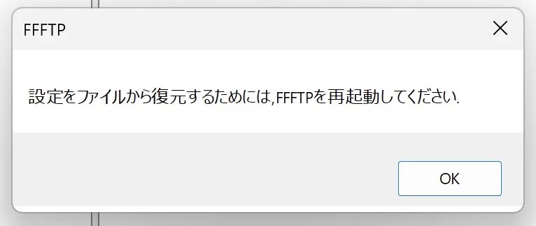 「設定をファイルから復元するためには、FFFTPを再起動してください」と表示されます