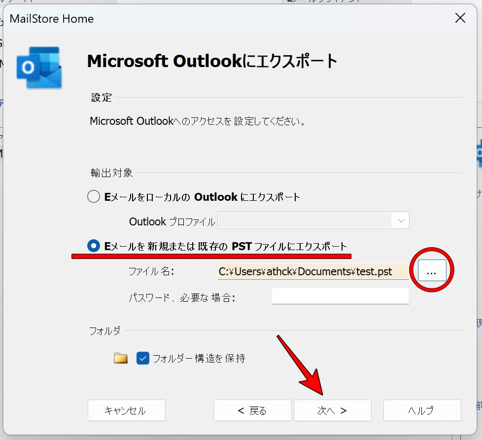 「Eメールを新規または既存のPSTファイルにエクスポート」を選び、ファイル名と保存場所を設定します。