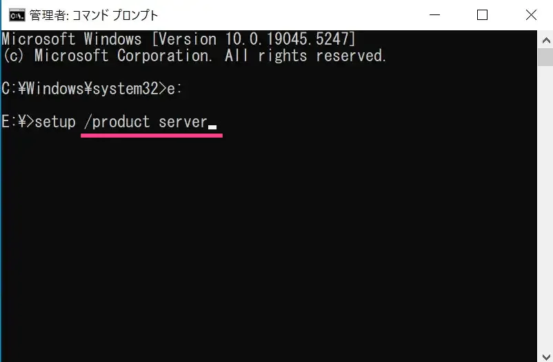 「(ドライブレター):」と入力してエンターを押します。私の環境はEドライブだったので「e:」と入力しました。