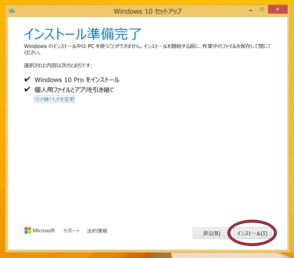 Windows10インストール準備完了の画面に切り替わったら「インストール」をクリックしましょう。