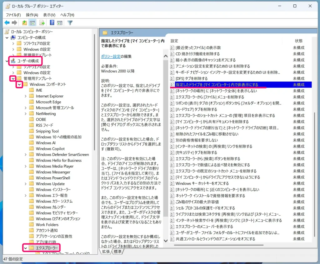 Windows11 | Cドライブをエクスプローラーから非表示にする